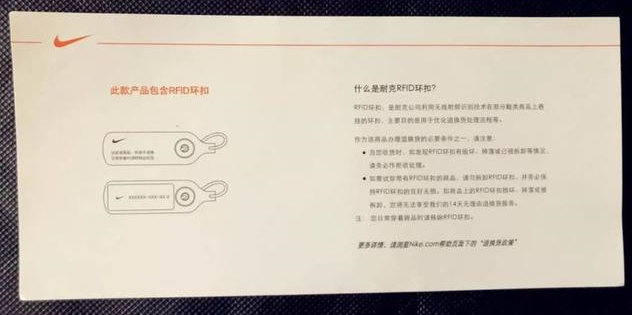 近年假冒伪劣商品泛滥,为防止自家商品被假冒充斥网络,以及恶意调包退货,Nike推出了带有RFID芯片的防盗扣,以此加强监管,并获得成效(上海市公安局破获涉案金额巨大的假鞋退货案)。
